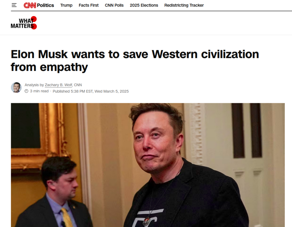Não é à toa que Elon Musk tem montado uma batalha contra a empatia. Em jogo nessa cruzada contra a empatia está não apenas o entendimento daquilo que é inteligência, mas, acima de tudo, o controle discursivo sobre as manifestações do poder e da força. Ser forte é ser egoísta! O capitalismo é uma forma de vida, não é meramente um sistema econômico, de tal sorte que ele precisa fomenta valores e ideias vinculadas à sua perpetuação, nesse caso, é preciso dizer, fomentar e justificar uma forma de egoísmo que transforme a sensibilidade às necessidades alheias em expressões de uma doença, em uma patologia atestada pelo dados estatísticos e os conceitos da nossa melhor ciência.